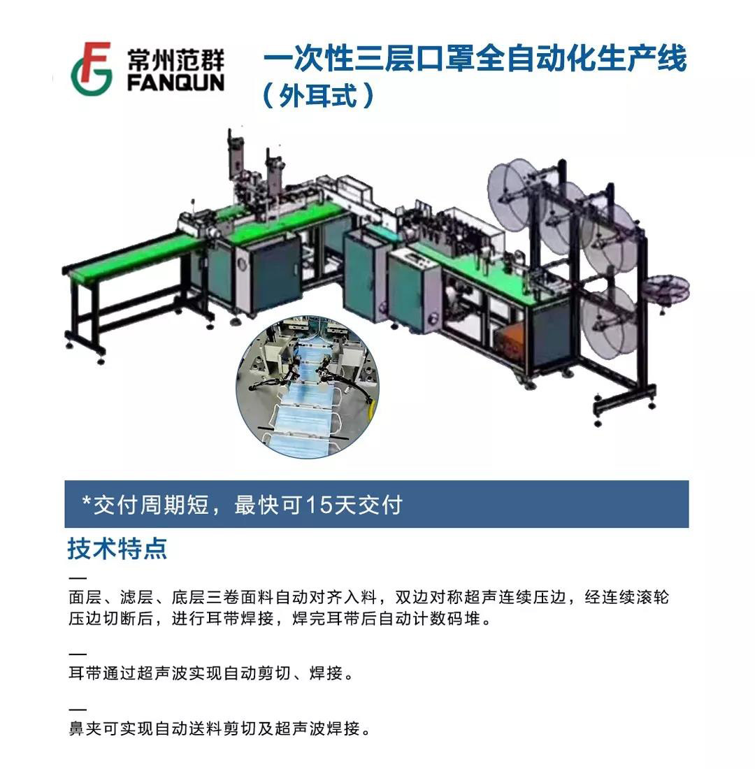 考慮到目前巨大的口罩需求矛盾,常州范群利用其自身的設(shè)備制造企業(yè)優(yōu)勢,在這個特殊時期,向客戶特別推出全自動一次性三層口罩生產(chǎn)線(外耳式一拖一)和全自動一次性三層口罩生產(chǎn)線(外耳式一拖二)兩款設(shè)備。以下為設(shè)備具體參數(shù)信息。
