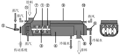 槳葉干燥機(jī)是一種以傳導(dǎo)為主的臥式攪拌型干燥機(jī)。主體結(jié)構(gòu)為帶有夾套的W型殼體內(nèi)裝有成對(duì)的空心低速回轉(zhuǎn)中空軸,軸上焊有若干攪拌葉片,夾套和空心攪拌葉片,其內(nèi)均通以熱載體,兩種加熱面同時(shí)對(duì)物料加熱。熱載體通常從干燥機(jī)中部送入,通過(guò)呈攪拌狀態(tài)的物料層表面,從另一側(cè)排出