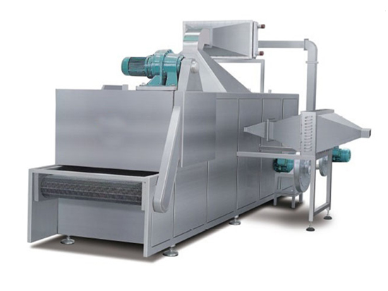 物料由加料器均勻地鋪在網(wǎng)帶上,網(wǎng)帶采用12-60目不銹鋼絲網(wǎng)。由傳動(dòng)裝置拖動(dòng)在網(wǎng)帶式干燥機(jī)內(nèi)移動(dòng)。網(wǎng)帶式干燥機(jī)由若干單元組成,每一單元熱風(fēng)獨(dú)立循環(huán),部分尾氣由專門排濕風(fēng)機(jī)排出,廢氣由調(diào)節(jié)閥控制,熱氣由下往上或由上往下穿過鋪在網(wǎng)帶上的物料,加熱干燥并帶走水分。網(wǎng)帶緩慢移動(dòng),運(yùn)行速度可根據(jù)物料溫度自由調(diào)節(jié),干燥后的成品連續(xù)落入收料器中。上下循環(huán)單元根據(jù)用戶需要可靈活配備,單元數(shù)量可根據(jù)需要選取。